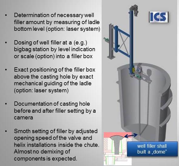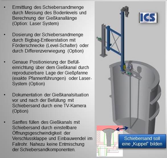 Die von ICS entwickelte Vorrichtung ermöglicht eine reproduzierbare Qualität bei der Befüllung des Gießkanals mit Schiebersand und insbesondere eine erhöhte Sicherheit für das Bedienpersonal. Die Dokumentation der Ergebnisse durch eine TV-Kamera dient der internen Qualitätssicherung.