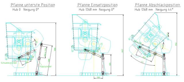 Mit dem Gießkran wird die Pfanne horizontal in den Quertransportwagen abgelegt und in den Ausbrechbereich gefahren. Das Feuerfestmaterial in der Gießpfanne wird mit schweren Stemmgeräten ausgebrochen. In der Ausbrechposition muss der Pfannenwagen mittels Hydraulikzylinder verriegelt werden können, um die Antriebe zu entlasten und ein Versetzen des Quertransportwagens während der Ausbrucharbeiten zu verhindern. Das ausgebrochene Feuerfestmaterial in der Gießpfanne soll mit einer Kippvorrichtung ausgekippt werden. Hierbei soll die Gießpfanne mit der Drehachse im Zentrum der Gießpfannenzapfen bis zu 45° gekippt werden. Das Verfahren des Quertransportwagen soll auch mit gekippter Gießpfanne (Kippwinkel 45°) erfolgen können.