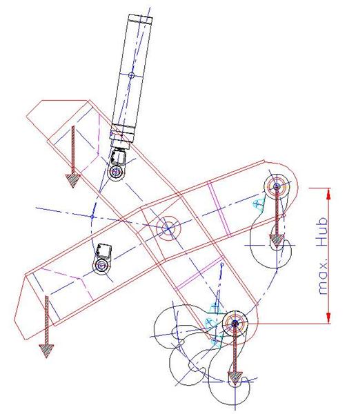 Parallelführung mit Kontergewicht und hydraulischer Betätigung. Parallelführung gleichzeitig hydraulische Schwenkmechanik.